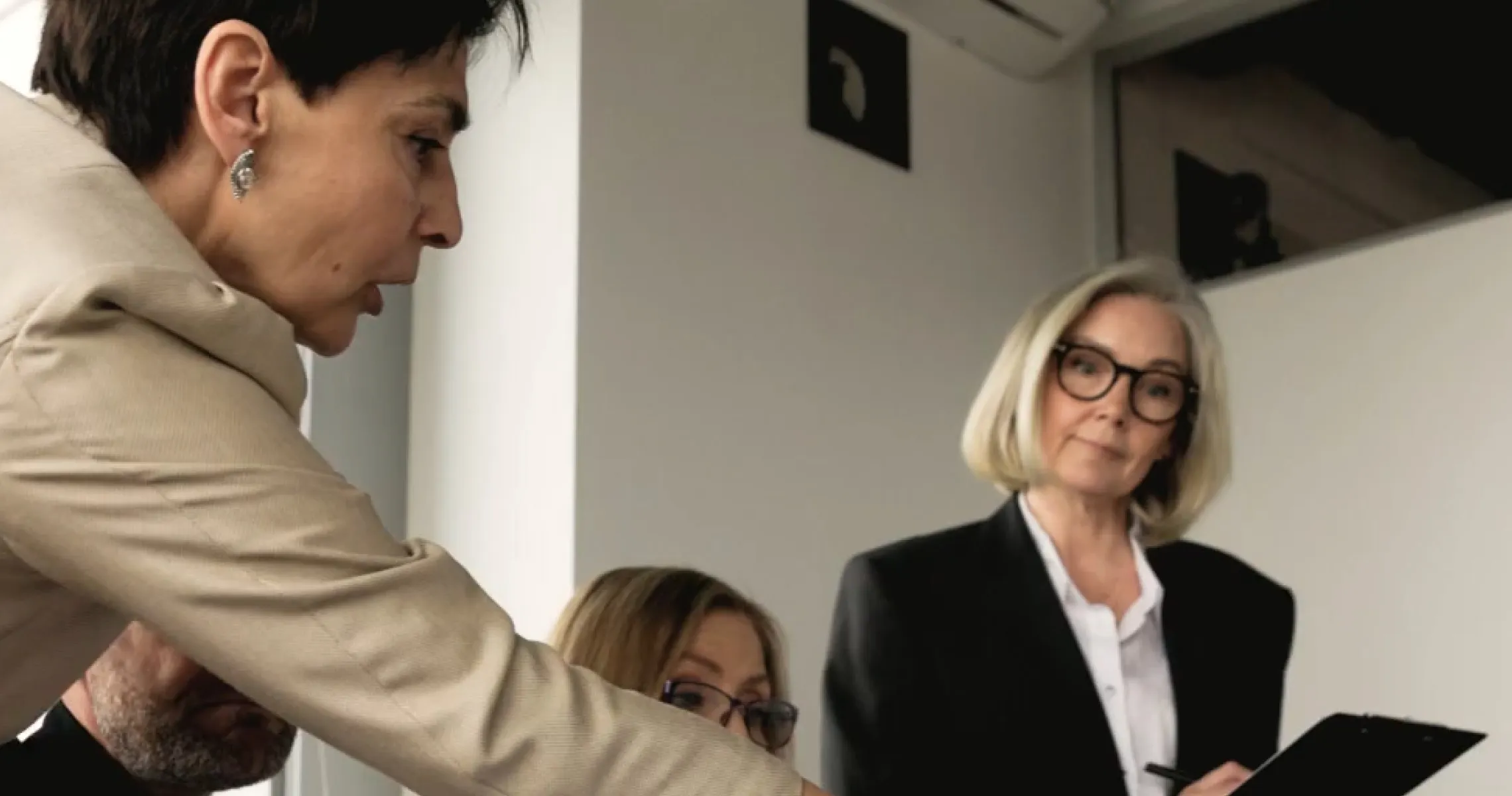 Three business professionals with glasses, two women standing and one man seated at a desk with documents and a laptop.